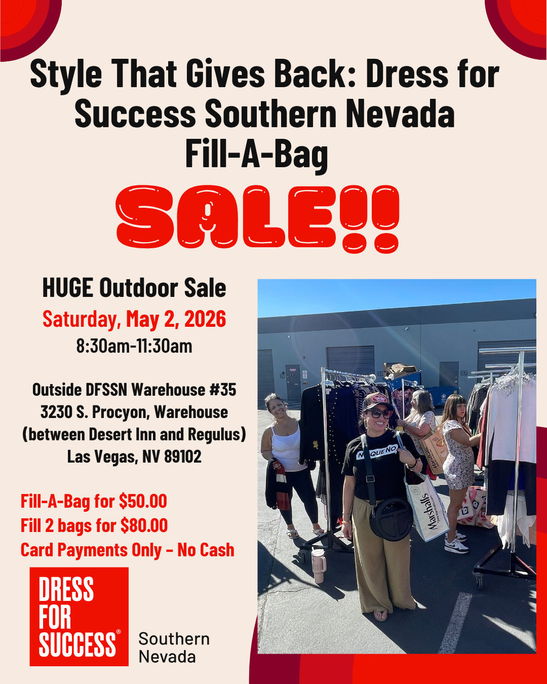 Join Dress for Success Southern Nevada for a HUGE outdoor Fill-A-Bag Sale on Saturday, May 2, 2026 from 8:30am–11:30am. Fill one bag for $50 or two bags for $80 — and every dollar goes directly toward empowering women in our community through programs like: