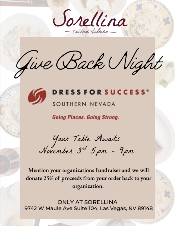 Enjoy an unforgettable evening of authentic Italian flavors while giving back to a great cause. When you dine at Sorellina and mention Dress for Success Southern Nevada (DFSSN), 25% of your order will be donated to empower women on their path to economic independence through professional development and support programs.