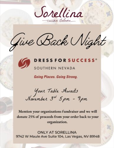 Enjoy an unforgettable evening of authentic Italian flavors while giving back to a great cause. When you dine at Sorellina and mention Dress for Success Southern Nevada (DFSSN), 25% of your order will be donated to empower women on their path to economic independence through professional development and support programs.